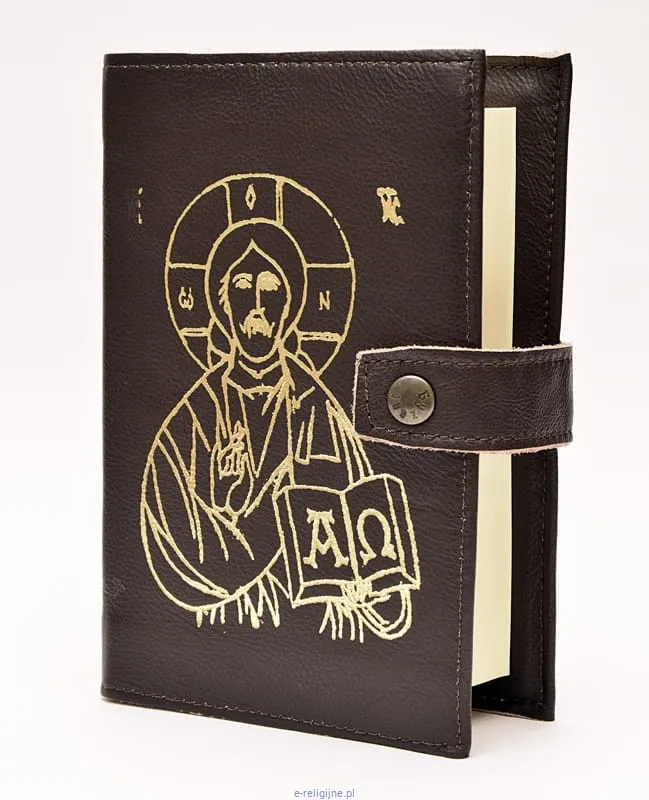 Skórzana okładka na Biblię Tysiąclecia z ikoną CHRYSTUSA PANTOKRATORA. Okładka pasuje na wydanie V - format oazowy 11,5 x 18 cm.