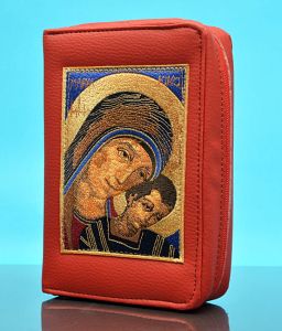 Skórzana okładka z ikoną Matki Bożej KIKO na Biblię Tysiąclecia - Pallotinum, wydanie V, tzw. format oazowy 11,5 x 18 cm.