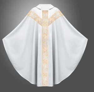 Ornat neogotycki biały wykonany z lekkiej, przewiewnej tkaniny typu gabardyna z naszytym pasem tkanym.
