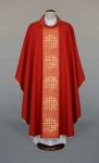 Elegancki ornat dla kapłana w kolorze czerwonym z nowoczesnymi haftami na pasach zdobionych złotą nicią.