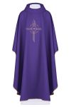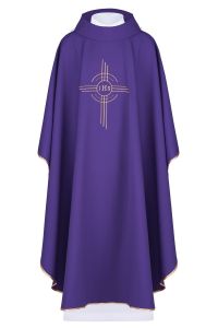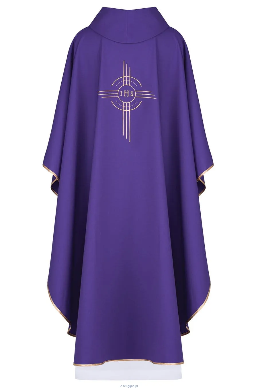 Lekki ornat fioletowy wykonany z wysokiej jakości gładkiej tkaniny, z nowoczesnym haftem i symbolem IHS wyhaftowanym z przodu i z tyłu.