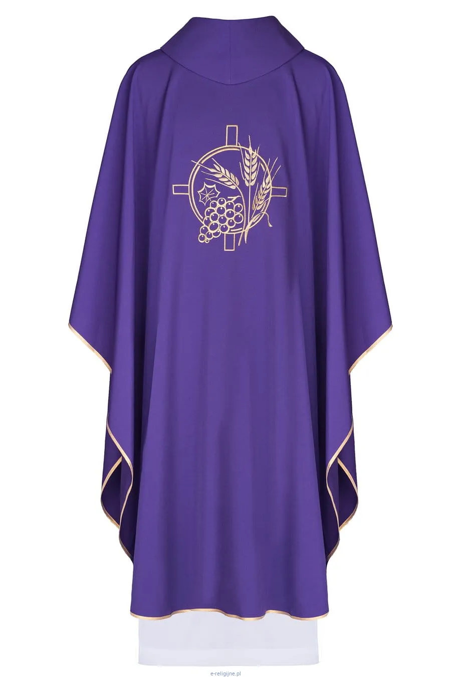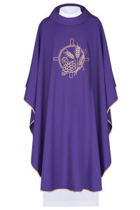Elegancki, delikatny ornat z prostym krojem, motywem eucharystycznym wyhaftowanym z przodu i z tyłu. Wykonany w wysokiej jakości gładkiej tkaniny z dodatkiem włókien naturalnych.