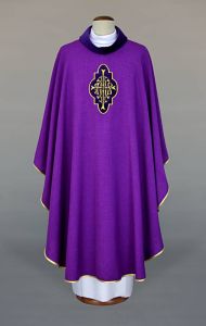 Ornat fioletowy z pięknym haftem na aksamitnej aplikacji wykonany z lekkiej przewiewnej tkaniny, wykończony pod szyją elegancką stójką - golfem.