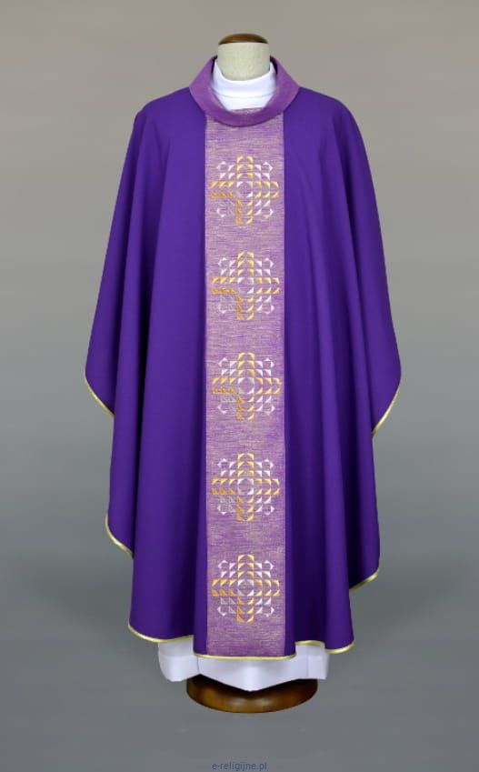 Elegancki ornat dla kapłana w kolorze fioletowym z nowoczesnymi haftami na pasach zdobionych złotą nicią.