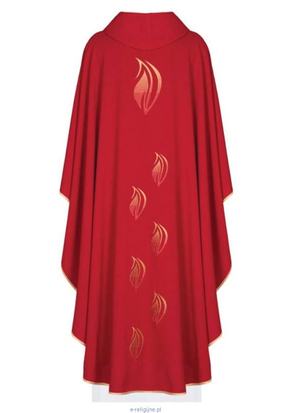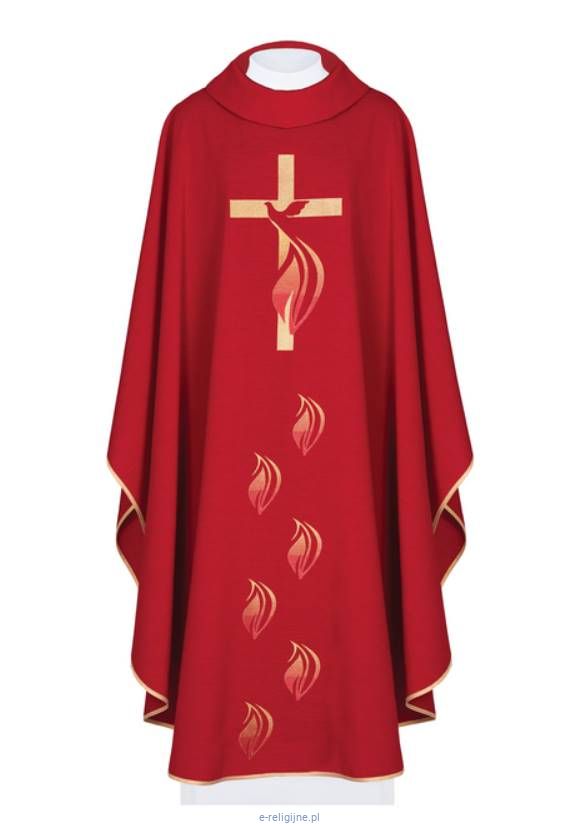 Czerwony ornat na bierzmowanie z wysokiej jakości tkaniny gładkiej z haftowanym symbolem Ducha Świętego.