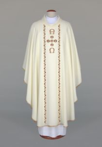Ornat został wykonany z lekkiej, przewiewnej tkaniny, która jednocześnie jest przyjemna w dotyku, co zapewnia komfort noszenia podczas długich ceremonii. Jego struktura przypominająca len nadaje mu wyjątkowego charakteru, podkreślając zarazem tradycję i uroczystość liturgii.