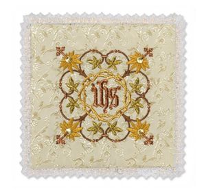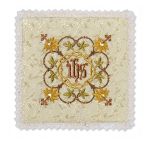 Tkanina żakardowa na palce charakteryzuje się subtelnym, reliefowym (wypukłym) haftowanym wzorem w stylu damasku, co nadaje jej szlachetny i uroczysty charakter. Brzegi paramentu wykończone są ozdobną, białą koronką, która dodaje lekkości i estetycznie dopełnia całość. Wewnątrz wszyte jest sztywne usztywnienie (wkład), które gwarantuje, że palka zachowa idealnie płaską formę, stabilnie spoczywając na czarze kielicha.
