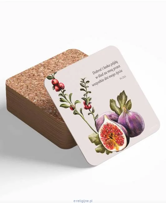 Korkowa podkładka pod kubek na stół, która może służyć jako doskonałe narzędzie ewangelizacji. Zawiera cytat z Księgi Psalmów: "Dobroć i łaska pójdą w ślad za mną ... " (Ps 23,6)