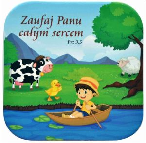 Podstawka korkowa z religijnym hasłem "Zaufaj Panu całym sercem Prz 3,5"