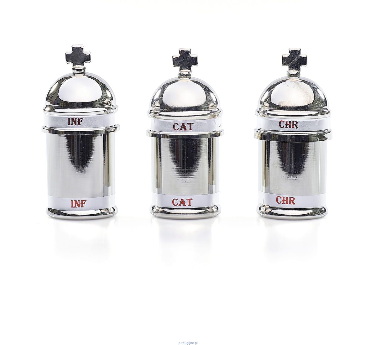 Zestaw pojemników na oleje święte - olej chorych (infirmorum), krzyżma (chrisma) i katechumenów (catechumenorum).