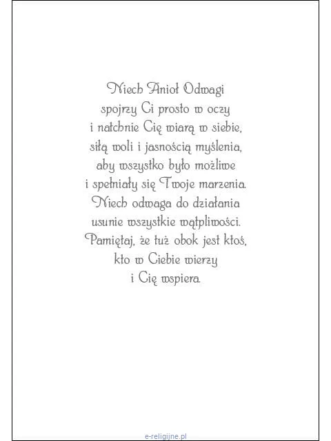 Wewnątrz karnetu zamieszczono piękne życzenia i prośby o wsparcie do wybranego anioła. To słowa, które będą dla obdarowanej osoby jak błogosławieństwo, którym chcesz ją umocnić. Wystarczy tylko podpisać się, choć możesz także dodać słowo od siebie.