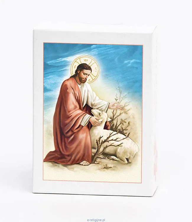 Scena ukazuje kluczowy moment przypowieści - Jezusa, który z czułością pochyla się nad odnalezioną owieczką. To doskonały punkt wyjścia do rozmowy o tym, że Bóg szuka każdego z nas i nigdy nie przestaje kochać.