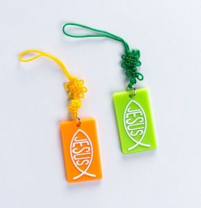 Religijna zawieszka do telefonu z chrześcijańskim symbolem ryby i wpisanym w ten symbol imieniem Jezus. Zawieszka wykonana z gumy, jest lekka i poręczna. Wymiary 2,3 x 4 cm. Do wyboru dwa kolory: pomarańczowy i zielony.