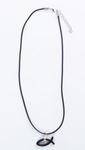 Piękny naszyjnik z chrześcijańskim symbolem rybki, na gumowym rzemyku z karabińczykiem umożliwiającym regulację długości w zakresie ok. 3 cm. Rybka o wymiarach 1,5 cm x 3 cm w kolorze hematytu. Dlugość rzemyka w zależności od regulacji od 22 cm do 25 cm.