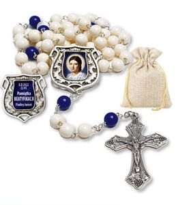 Pamiątkowy różaniec przygotowany specjalnie dla uczczenia uroczystości beatyfikacyjnych założycielki kół różańcowych Służebnicy Bożej Pauliny Jaricot.