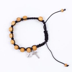Bransoletka wykonana z drewnianych koralików o wyglądzie imitującym drzewo oliwne, przyjemnych w dotyku oraz sznurka zaciskanego na ręce za pomocą specjalnego splotu. Dzięki temu średnicę różańca można regulować w zależności od potrzeby - w zakresie 6,5 cm - 9 cm.