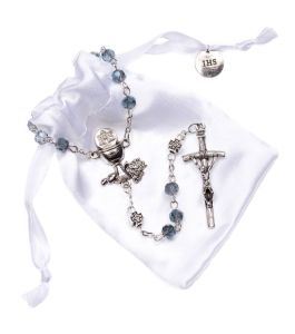 Szklany różaniec komunijny dla chłopca. W zestawie z etui - w skład zestawu wchodzi satynowy woreczek z elementami nawiązującymi symboliką do uroczystości I Komunii.