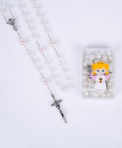 W naszym sklepie dbamy o to, by produkty wspierały duchowy rozwój. Ten różaniec na metalowym łańcuszku, z biało-różowymi perełkami, jest lekki i wygodny dla małych rąk, a dołączone pudełko chroni go przed codziennym zużyciem.