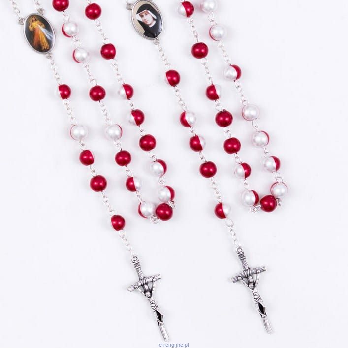 - Biało-czerwone koraliki o średnicy 8 mm nawiązujące do promieni z obrazu Jezusa Miłosiernego