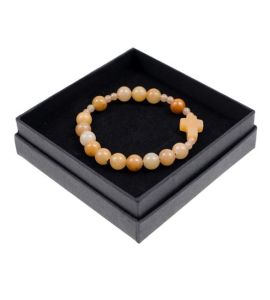 Różaniec bransoletka na rękę na elastycznym sznurku umożliwiającym dopasowanie do różnej grubości ręki.