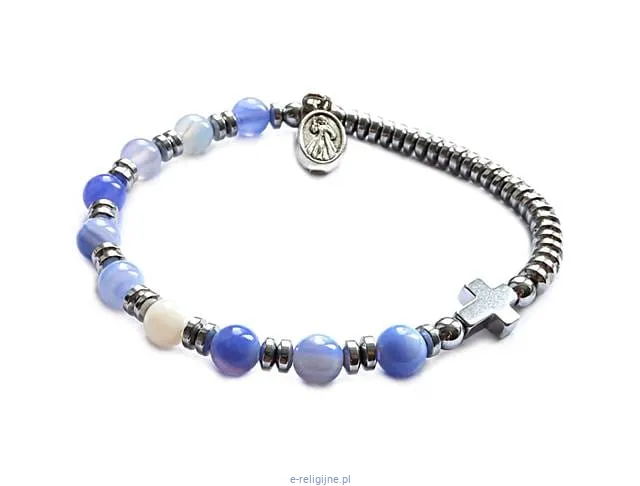 Różaniec na rękę - dziesiątka w formie eleganckiej i praktycznej bransoletki. Bransoletka wykonana ręcznie z kamieni błękitnych agatów, oraz srebrnego hematytu.