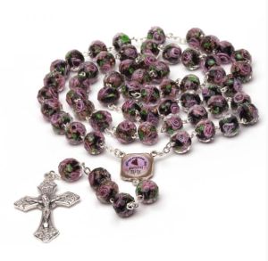 Ręcznie wykonany różaniec ze szkła weneckiego dedykowany św. Ricie z Cascii. Paciorki wykonano ręcznie, łącznie ze szklanymi różami zatopionymi w koralikach ze szkła weneckiego.