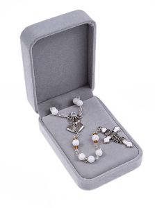 Różaniec z białego ONYKSU w pudełku - Pamiątka I Komunii Świętej R1382
