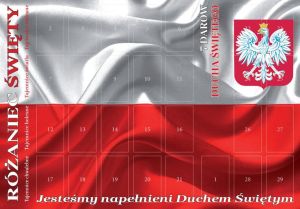 Sprawdziany kontrolki na różaniec na rok 2018 - nawiązujący grafiką do 100 lecia odzyskania przez Polskę niepodległości oraz trwającego w kościele Roku Ducha Świętego.