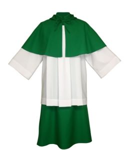 Strój ministrancki dwuczęściowy: spódnica na gumie i wiązana pelerynka.