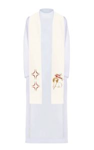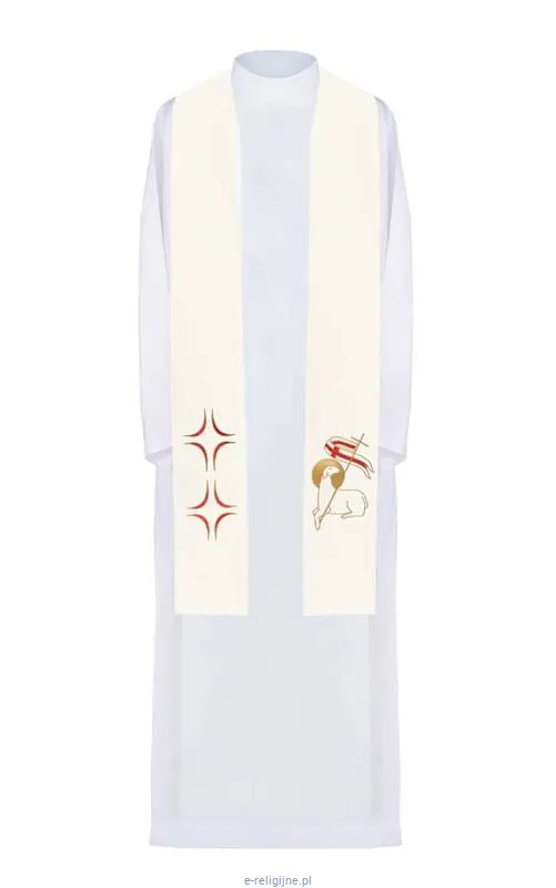 Stuła jednostronna wykonana z wysokiej jakości tkaniny gładkiej, zdobiona haftem krzyża i baranka.