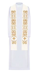 Stuła jednostronna wykonana z wysokiej jakości tkaniny gładkiej, zdobiona bogatym haftem z symbolem Krzyża.