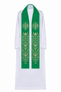 Bogato haftowana stuła kapłańska w kolorze zielonym. Haft z motywem eucharystycznym wykonany złotą nicią.
