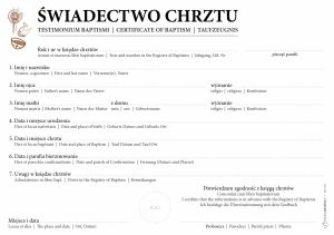 Parafialny druk akcydensowy - Świadectwo Chrztu w 3-językach