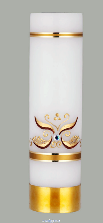 Biała świeca liturgiczna (30cm x 8cm) ze złotymi pasami i eleganckim ornamentem z osadzonym kryształkiem. Korpus z wysokiej jakości parafiny z wbudowaną tubą na wkład olejowy. Ponadczasowa elegancja w najczystszej formie!