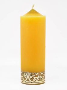 Żółta świeca ołtarzowa wykonana z parafiny z dodatkiem kadzidła o wysokości 20 cm i średnicy ok. 6,5 - 7 cm .