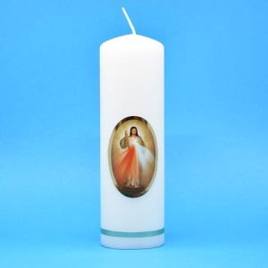 Biała świeca o wysokości 20 cm i średnicy 6 cm z naklejką z wizerunkiem Pana Jezusa Miłosiernego.