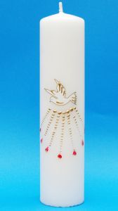 Świeca ołtarzowa na bierzmowanie, ręcznie zdiobiona. Wysokość 24 cm, średnica ok. 6 cm, waga ok. 0,9 kg. Do wykorzystania jako świeca ołtarzowa, w procesji z darami lub do dekoracji kościoła.