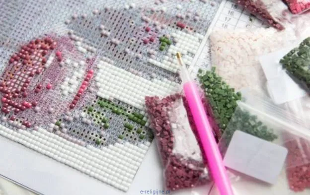 Zestaw do samodzielnego układania religijnej mozaiki za pomocą kwadratowych małych koralików w kształcie diamentów.