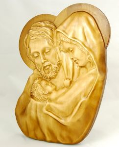 Płaskorzeźba z wizerunkiem Świętej Rodziny wykonana w drewnie lipowym. Bejcowana i lakierowana.