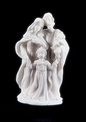 Rzeźba przedstawiająca Świętą Rodzinę. Rzeźba wykonana z alabastru syntetycznego - figury i rzeźby wykonane z tego materiału charakteryzują się dużą trwałością oraz śnieżnobiałym kolorem. Rzeźba może być pięknym upominkiem z okazji ślubu, czy rocznicy zawarcia Sakramentu Małżeństwa.