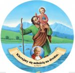 - Św. Krzysztof niosący Dzieciątko Jezus przez rzekę. U dołu napis "Boże błogosław naszej podróży, spraw abym jechał bezpiecznie i szczęśliwie dotarł do celu." W rogu obrazek Jana Pawła II.