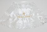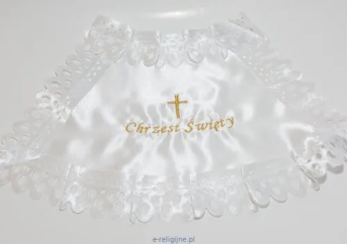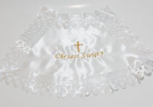 Biała szatka do chrztu wykonana z tkaniny atłasowej, obszyta ażurową koronką atłasową. W centralnej części wyrobu wyhaftowany krzyż i napis "Chrzest Święty".