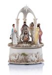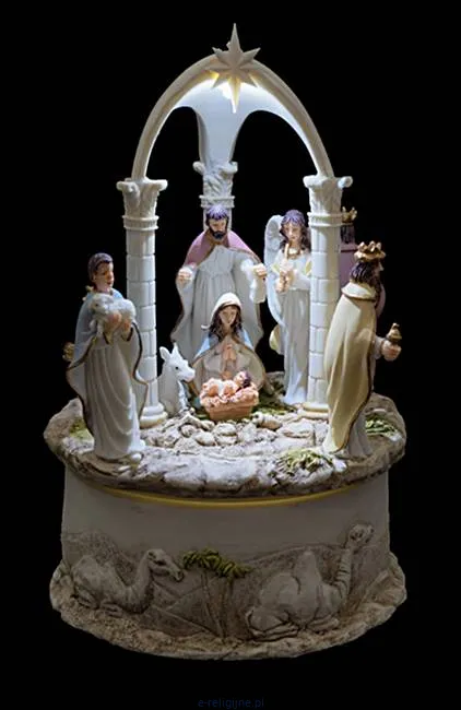 Wspaniała szopka ze Świętą Rodziną. Podświetlana z pozytywką. Figurki wykonane z masy żywicznej.