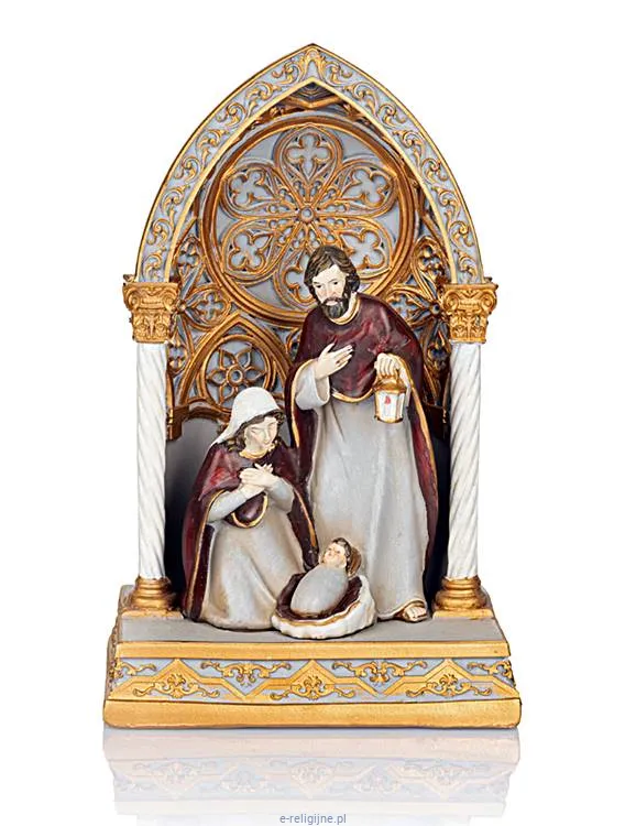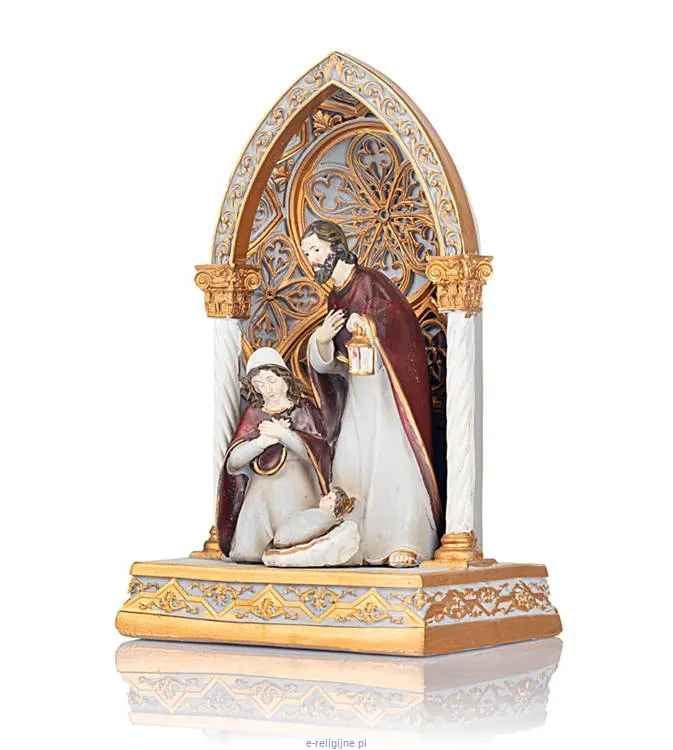Monumentalny, złocony łuk gotycki stanowi królewską oprawę dla najważniejszego wydarzenia w dziejach ludzkości. Burgundowe szaty postaci kontrastują ze złotymi zdobieniami, tworząc kompozycję godną największych mistrzów sakralnego rzemiosła. Ażurowy ornament przypominający gwiazdę betlejemską wieńczy całość, podkreślając wyjątkowość momentu narodzin Zbawiciela.
