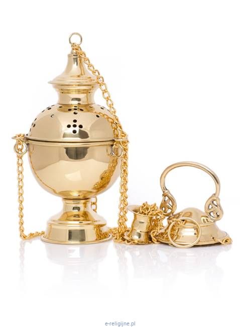 Wykonany z trwałego odlewu mosiężnego, charakteryzuje się złocistym połyskiem i starannie wykonanymi detalami. Jego smukła sylwetka z charakterystyczną kopułą nie tylko dobrze prezentuje się w przestrzeni sakralnej, ale też zapewnia wygodę użytkowania podczas codziennych obrzędów i uroczystych celebracji.