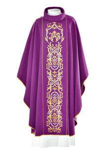 Uroczysty ornat liturgiczny wykonany z wysokiej jakości tkaniny gładkiej, zdobiony pasem z haftowanym symbolem IHS.
