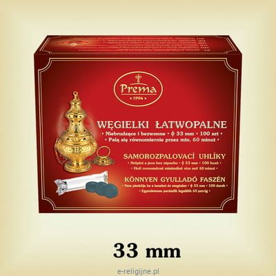 Łatwopalne i małobrudzące węgle do kadzielnicy. Czas palenia minimum 60 min. Rolka zawiera 10 węgielków. Średnica 33 mm. W opakowaniu 10 rolek. Producent PREMA.