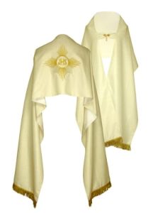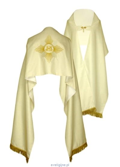 Welon do przenoszenia Najświętszego Sakramentu z tkaniny ecru ze złotą nitką, zdobiony złotymi frędzlami i haftem, zapinany klamrą.