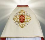 Welon liturgiczny z wyhaftowanym motywem IHS na plecach.