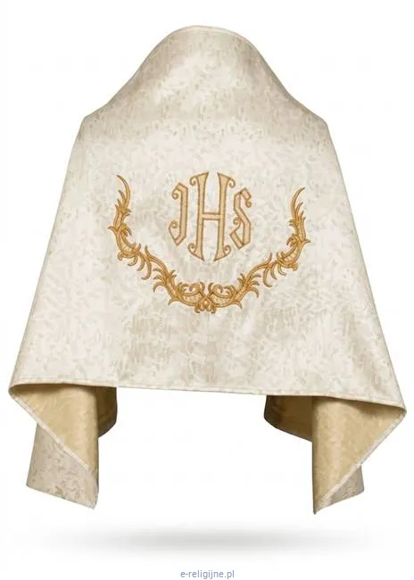 Welon liturgiczny W-AS511 wyróżnia się bogatym, maszynowym haftem na plecach, przedstawiającym klasyczny motyw IHS otoczony kłosami zbóż i winoroślą, co bezpośrednio nawiązuje do symboliki chleba i wina. Całość wykończona jest złotymi frędzlami na brzegach, a przód welonu spinany jest elegancką, mosiężną klamrą w kolorze złotym, która gwarantuje stabilność szaty na ramionach nawet podczas marszu pod gołym niebem.